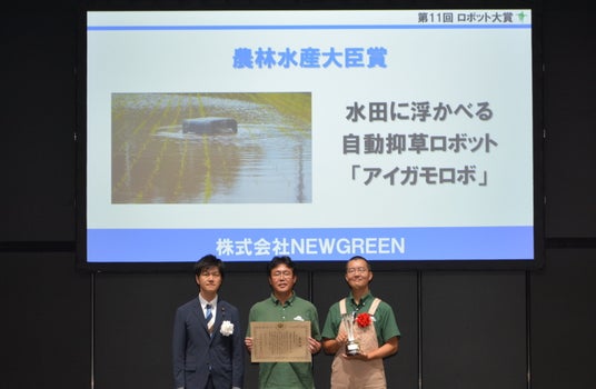 株式会社NEWGREENが開発製造する「アイガモロボ」が第11回ロボット大賞において「農林水産大臣賞」を受賞いたしました。第11回となる今回は全85件の応募があり、審査特別委員会により各賞の表彰対象が決定され、農林水産大臣賞は全応募のうち同省が行う政策上の観点から最も優秀であると認められるロボット等に授与されるものです。(第11回ロボット大賞受賞一覧)