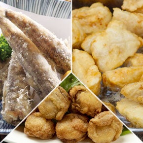 メヒカリ唐揚げ、あんこう唐揚げ、ホタテ唐揚げ