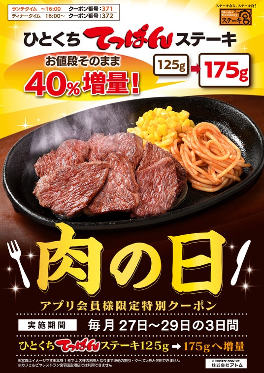ご注文時に、クーポン番号を従業員にお伝え頂くと、ひとくちてっぱんステーキ125g(グランドメニュー通常価格:1,490円(税込1,639円)を、お値段そのままで175g(グランドメニュー通常価格:1,990円(税込2,189円))で、ご提供させていただきます。