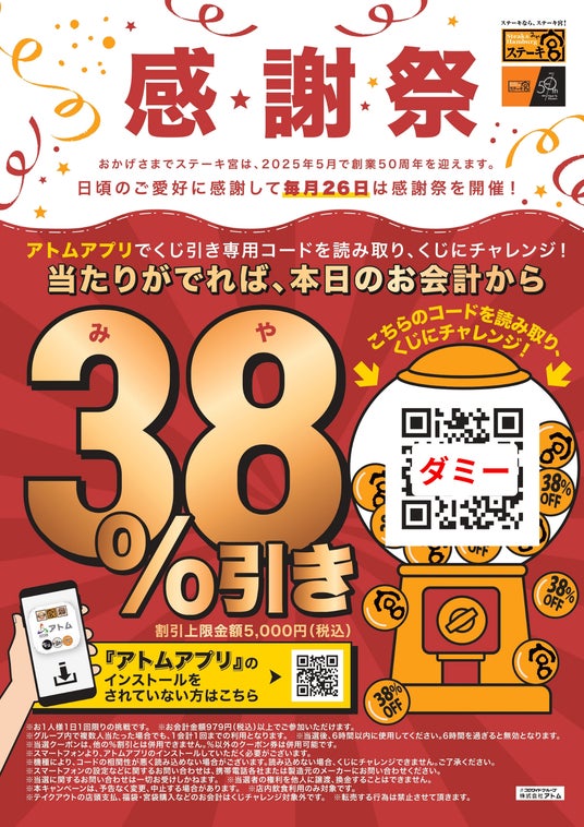 来年迎えるステーキ宮創業50周年に向けたカウントダウンとして、7月から開始した大好評の恒例イベント! 「感謝祭」は毎月26日に“宮”にちなんだ“38%”引きクーポンがあたる“みやくじ” を実施。くじに当選すると、当日のお会計から38%割引をさせていただきます。また、ステーキ宮毎月恒例「肉の日」を今月も27日~29日の3日間実施。アトムアプリ会員様・SNSフォロワー様限定でお値段そのまま!ひとくちてっぱんステーキ40%増量クーポン(税込500円お得)を配信いたします。