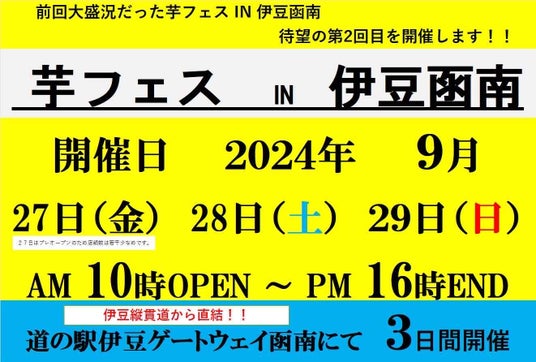 2024年9月27-29日伊豆函南ゲートウェイにて開催予定の芋フェスの出店者がついに発表された。
