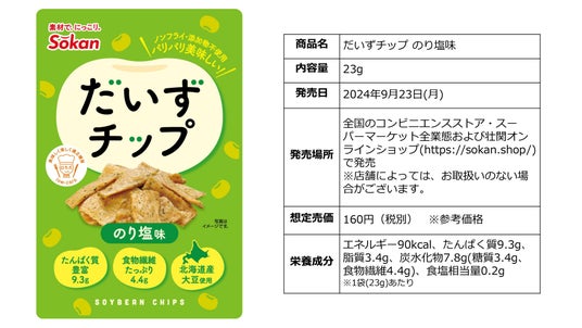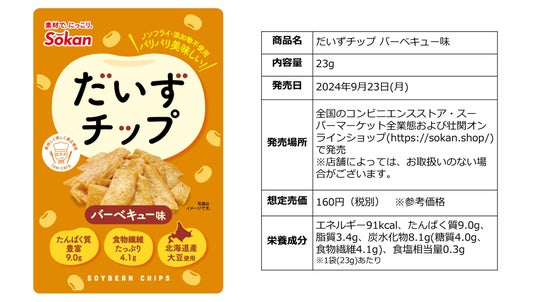 株式会社壮関(本社:栃木県矢板市 代表取締役社長:板山 健一)は、新商品『だいずチップ のり塩味/バーベキュー味』を2024年9月23日(月)より全国のコンビニエンスストア・スーパーマーケット全業態および壮関オンラインショップ(https://sokan.shop/)で発売いたします。