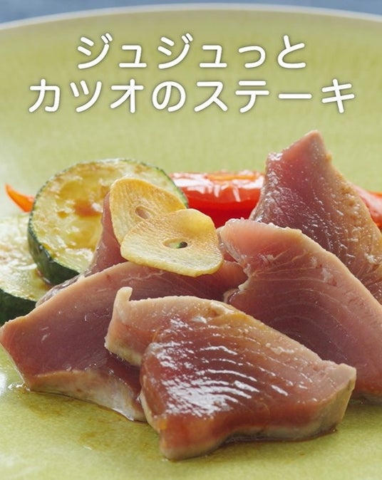 ニンニクの香りでサッと表面を焼くだけで、お肉のようにとてもジューシーな和風のカツオステーキ。 お子様のご飯のおかずや、お酒の肴にもピッタリ。