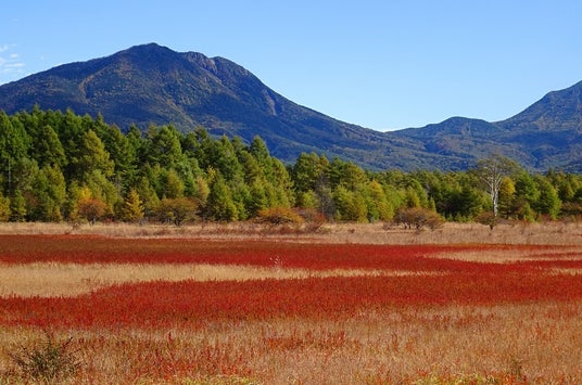 9月下旬から10月上旬にかけて、一面に広がるホザキシモツケなどの草が赤く色づき、草紅葉(くさもみじ)となります。また、10月中旬ごろからはミズナラやカラマツなどが黄色に染まる黄葉が見事です。