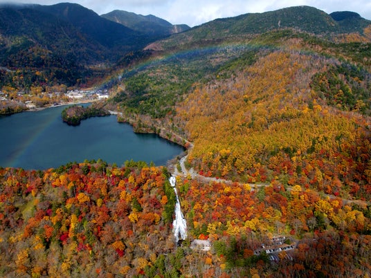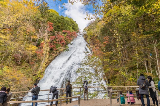 紅葉の中流れ落ちる湯滝は迫力満載(湯ノ湖畔)