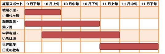 栃木県奥日光の湯ノ湖畔に立つリゾートホテル「休暇村日光湯元」(所在地:栃木県日光市湯元温泉 総支配人:川崎孝利)の周辺では、9月下旬頃の日光白根山を起点として、関東でもいち早く山々が色付き始めます。10月以降には、湯ノ湖や戦場ヶ原・中禅寺湖・いろは坂、そして11月頃に見ごろを迎える世界遺産「日光の社寺」まで、長く紅葉をお楽しみいただけます。