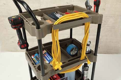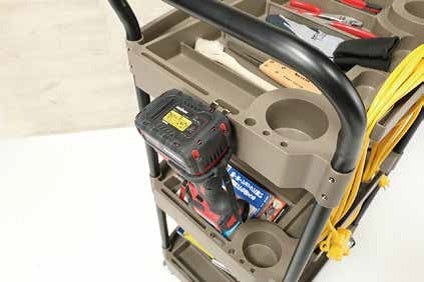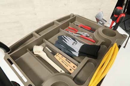 また、本製品には6枚の仕切り版が付属しており、収納する道具のサイズに合わせてトレーを仕切ることができます。さらに、各トレーには、電動工具やドライバーなどを収納できる工具ホルダー、スプレー缶などを収納できる缶ホルダー、延長コードなどをまとめておけるコードフック付きで、床に置いてしまいがちな道具も片付けることができます。