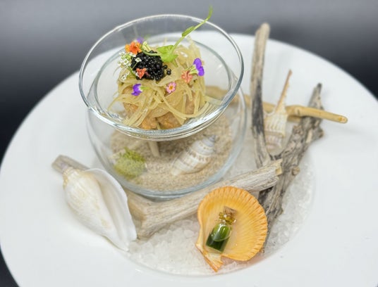 2024年8月鹿児島県徳之島フェアより「徳之島直送鮮魚と青パパイヤのカルピオーネ パッションフルーツのアクセント」/ 貝殻や砂、流木も現地のものでその土地の景色を表現。