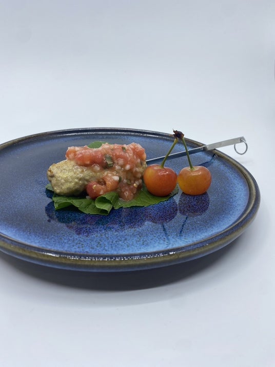 2024年6月山形県フェアより「やまがた雪豚のサテ さくらんぼのマリネを添えて フレッシュトマトとバジルのソース」