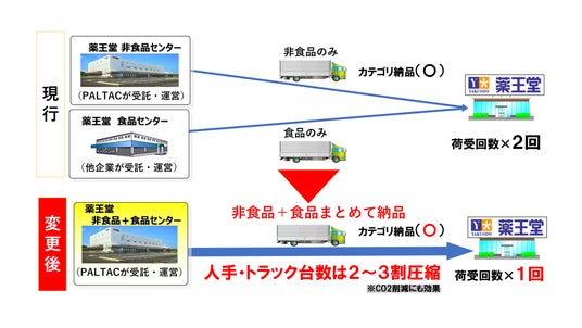 薬王堂とPALTACが属するサプライチェーンは、2024年問題をはじめ人手(ドライバー)不足に端を発する配送費・人件費やエネルギーコストの高騰といった経済的課題や、働き方改革・ホワイト物流・二酸化炭素排出量の削減といった社会的課題など様々な課題に直面しています。これまでPALTACと他企業様へ別々で委託している薬王堂の非食品部門及び食品部門の物流を、南東北エリアにおいてPALTACへ一括して委託し、これらの課題を同時に解決することを目指します。