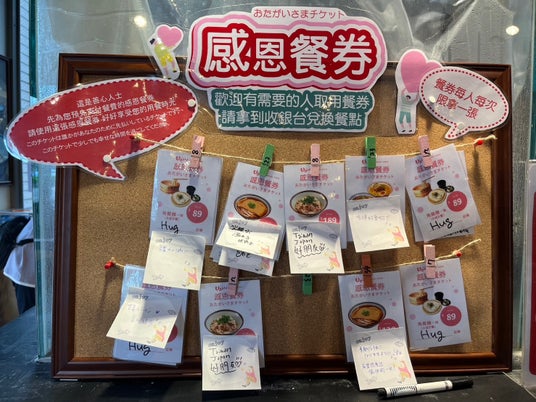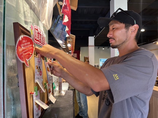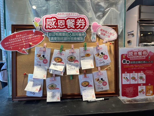 お互いさまチケット購入者へメッセージを記入してお店奥に設置されたボードに貼る。いただいた恩や優しさは別の方へ優しさをおくる。