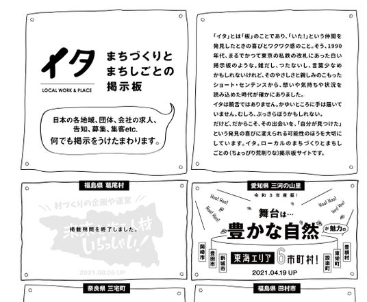地域と人と仕事をマッチングするなんでも掲示板「イタ」は、地域を盛り上げる出会いとコミュニケーションのプラットフォームとして、みなさんのまちに貢献します。「イタ」を通じて、あなたの地域に新しい魅力と価値を生み出してみませんか?