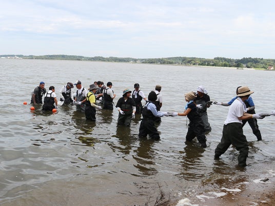 参加者一同は、望岡典隆さんの指導を受けながら、涸沼に入って石を運び、石倉カゴを設置しました。
