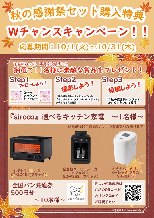 ・Wチャンスの応募は、セット内のオリジナルステンレスボトルを撮影し、「#秋の感謝祭パンフォト2410」をつけて