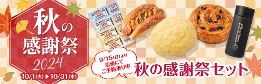 ベーカリーカフェの先駆けとして「ヴィ・ド・フランス(VIE DE FRANCE)」を全国展開し、昨年創業40周年を迎えた株式会社ヴィ・ド・フランス(本社:東京都江戸川区)は、2024年10/1(火)~10/31(木)の期間、『秋の感謝祭セット』を数量・期間限定で販売します。販売に先だって、9/15(日)~9/30(月)に予約を実施!お早めにお買い求めください。