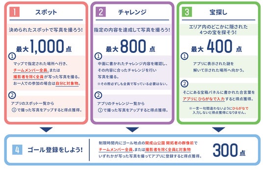 (2) パンフレット記載のスポットを撮影・登録して得点を獲得。買い物や謎解きクイズ等のチャレンジミッションで高得点も可能。