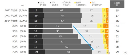 2024年7月に全国の20~79歳の男女3,000人を対象とした「防災に関する調査(2024)意識編」(株式会社クロス・マーケティング)によると、66%の人が「防災の必要性」に対して「そう思う」と回答しています。近年、多発する自然災害の影響で、生活者の防災意識は高まっていると言えるでしょう。また、防災の必要性については年齢が上がるほど必要に感じる人が増える傾向にあります。