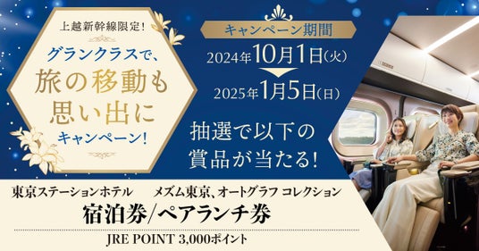 ○ JR東日本新潟支社では、新幹線eチケットで上越新幹線のグランクラスをご利用のお客さまを対象に、「東京ステーションホテル」「メズム東京、オートグラフ コレクション」の宿泊券やレストランのペアランチ券、JRE POINT 3,000ポイントが総勢70名様に抽選で当たる「グランクラスで、旅の移動も思い出に」キャンペーンを2024年10月1日(火)から開催します。