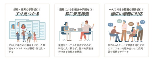 さまざまなスキルセットを持った優秀なアシスタントチームがあなたの仕事をサポートする業務効率化のサービスです。バックオフィス系の業務(人事、経理、営業事務、資料作成など)をオンラインアウトソーシングとして請け、コア業務に集中できる環境作りに貢献します。