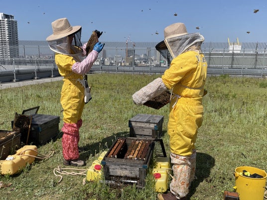 大丸心斎橋店社員の発案により始まった、地上約60mに位置する百貨店の屋上で都市養蜂に挑むプロジェクト。