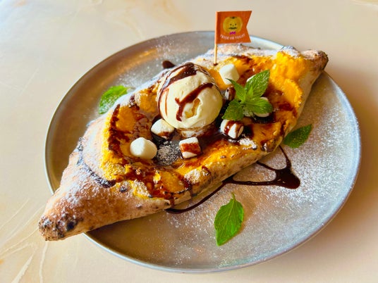 秋の味覚のかぼちゃと、マスカルポーネ、マシュマロ、メープルシロップを入れた包み焼きピッツァです。アツアツのピザとバニラアイスをいっしょにお召し上がりください。