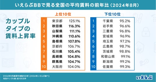 2. カップルタイプ、平均賃料の上昇率トップ10に地方7県がランクイン!