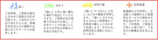 介護が必要な方、医療依存度の高い方、退院直後で状態が不安定な方など、この4つのサービスによって、住み慣れた家・地域での生活が継続できるよう、介護と医療の両面から支援させていただきます。