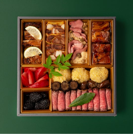 信州ブランド肉の味わいが詰まった参の重では、じっくり仕上げた「信州プレミアム牛 ローストビーフ」や48時間漬け込んだ「信州地鶏真田丸ジャークチキン」など、シェフの手仕事が効いた一品を。希少な小布施栗や長野県産桑の実を使った甘味もご一緒に。