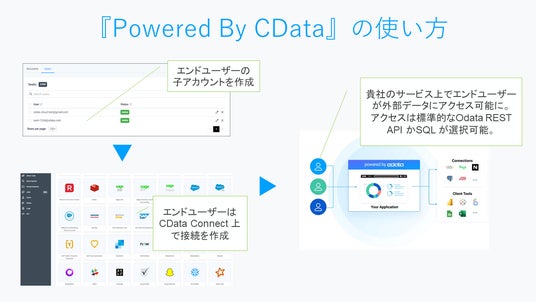 Powered By CData の使い方はシンプルです。サービスベンダーが親となるCData Connect Cloud を契約し、サービスベンダーのプラットフォームから、1.エンドユーザーの子アカウントを作成する操作をCData Connect Cloud 側に指示します。2.エンドユーザーはCData Connect Cloud サービスの画面を通じてSalesforce やクラウドデータベースなどの接続を希望するサービスへの認証・接続を行います。そして、3.サービスベンダーのプラットフォームからCData Connect Cloud に対して標準的なクエリ方法(OData REST API もしくは SQL)でクエリを発行するだけで、接続したサービスのデータがクエリできます。