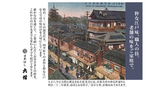 明治三十三年創業以来、四季折々の素材と粋な江戸ならではの 味付けを大切にしています。確かな技を通じてご愛顧いただくお客さまとの絆を、これからの 百年先までも変わらず守り続けて参ります。