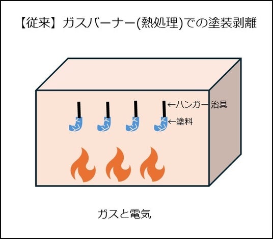 主にガスを熱源とする従来の塗装剝離工程は、剥離時間が長いため化石燃料を多く使用します。ショットブラストによる手法も同様に、ハンガー治具へ強いダメージを与えていました。