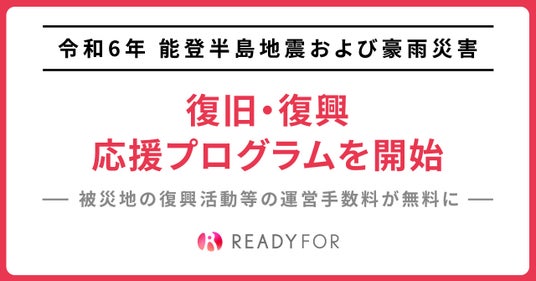 「令和6年能登半島地震および豪雨災害 復旧・復興応援プログラム」が適用となった活動については、READYFORの運営手数料が無料となり決済手数料(5%)のみで、クラウドファンディングの実施が可能となります。
