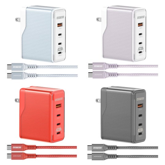 本製品は、パステル調のブルー、パープル、そして人気のレッド、ブラック(スペースブラック)の4色のカラーバリエーションを展開し、150W出力対応のパワフルなPD充電器です。