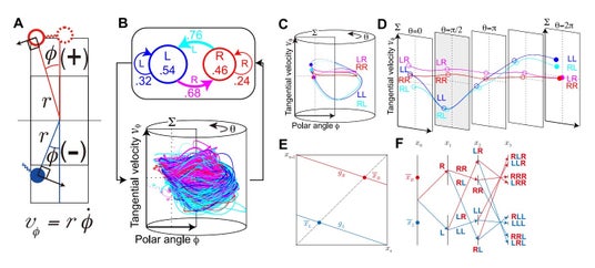 図2 Aはコート上の動きの定義で、極座標系でのコート上の位置(角度)とその接線方向の速度で表しています。Bはショット角度(L:左かR:右)が移り変わる確率(遷移確率:上)と、そうして打球コースが移り変わったときのコート上の動き(打球コースに対する動きの時間変化:下)。C、Dは移り変わりの4パタン(LからR、RからR、LからL、RからL)ごとに平均した軌道。Eは回転のあるカントール集合の2つの関数(左右)で、Fがその時間発展。X2のところがデータ(θ=π/2のグレーの面)と順番が一致しています。