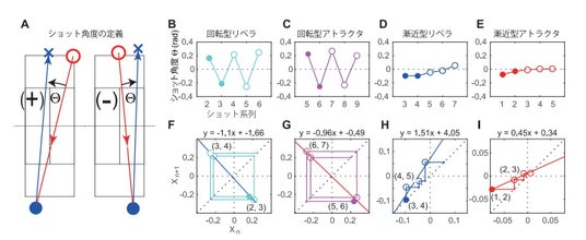 図1 典型的な打球コースの規則性。Aがショット角度の定義。上段(B-E)が打球コースの時系列。下段(F-I)がリターンマップ分析。Fの縦軸と横軸に、Bのショット系列2と3の角度と3と4の角度をそれぞれ異なる2点として、その2点を線で結びました。同じように、C、D、EからG、H、Iを書きました。これらの図から時系列をFからIまでの4つの規則性に分類することができます。