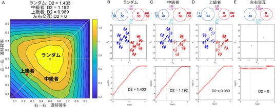 図3 Aはショット角度が右-右と移り変わる確率(横軸)と、左-左と移り変わる確率(縦軸)を変更しながら計算した相関次元。完全にランダムでは、図の中央(0.5-0.5)に来る。B-Eは4つの遷移確率(上段)におけるポアンカレ断面(図2D)のフラクタル図形(中段)と相関次元(下段)