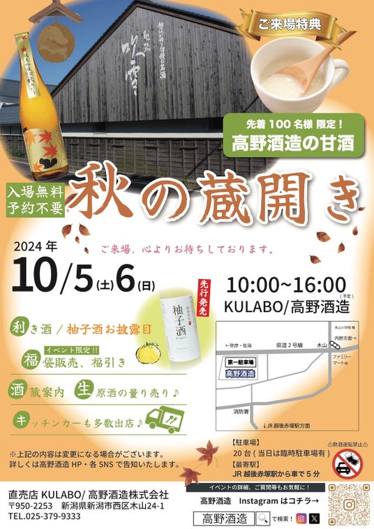 高野酒造株式会社(本社:新潟県新潟市西区、代表取締役:高野英之)は、来る10月5日(金)と6日(土)の2日間、恒例の蔵開きイベントを開催いたします。今年は、秋の新作日本酒リキュール「越路吹雪 柚子酒 Premium」の初お披露目を記念し、より一層盛りだくさんの内容でお客様をお迎えいたします。