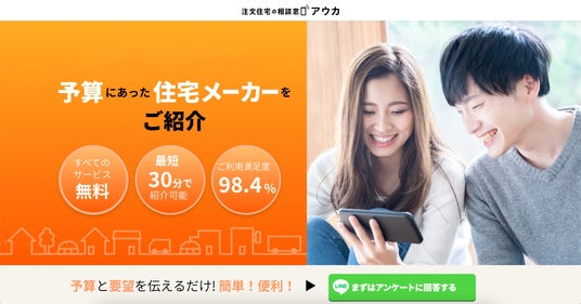 家を建てたい人には、住宅ブランドのご紹介から、訪問予約、訪問後のご相談、営業スタッフとのやりとり仲介まで、知識豊富なプロのaukaオペレーターが本当にマッチする住宅会社との出会いを無料でお手伝いしています。便利なLINEがメインだから、スマホさえあれば忙しい方でも大丈夫。プロから見たセカンドオピニオンや本物の口コミ情報の提供、住宅会社へのお断り代行も行っており、インターネットやSNSに溢れる信憑性の不確かな情報に惑わされることなく、いつでもどこでも安心して進められる理想の家づくりを応援しています。