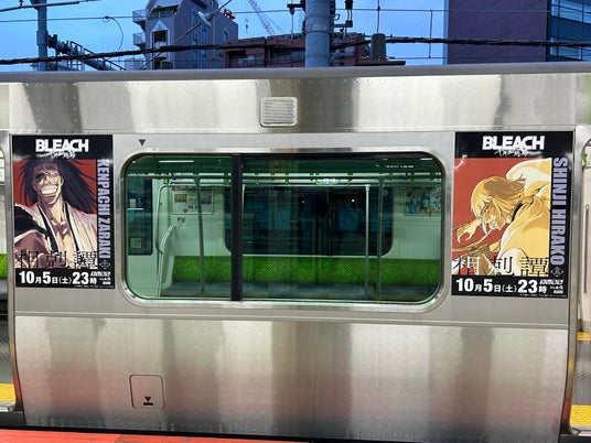 この度、TVアニメ『BLEACH』の20周年と第3クールの放送を記念して、「BLEACH」のキャラクターをあしらった山手線ラッピングトレインの運行が本日9月29日から開始しました。新規で描きおこしたビジュアルは主人公・黒崎一護をはじめ、作品でも屈指の人気を誇る護廷十三隊の隊長陣などが並ぶ迫力のあるビジュアルで、全11種類の広告がデザインされております。9月29日から10月12日までの期間、全4編成で運行しますので、10月5日の放送と合わせて是非ご注目ください!さらにこちらのビジュアルを使用した商品も今後発売予定となっておりますのでご期待ください。