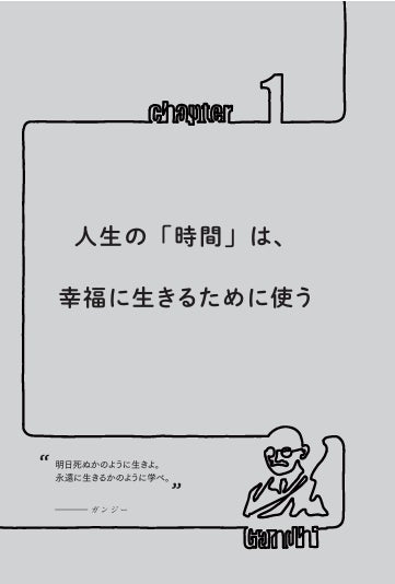ウェルスクが、これまでに実績のあるタスク管理法がつながり、発展したタスク管理の「結論」であることを1本の線で表現しています。各chapter扉に書かれている時間や目標、夢などに関する名言と、YUIHALFさんの遊び心のあるデザインも必見です。