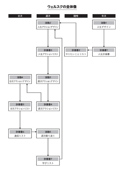 ウェルスクはスクラムをベースに、「個人」が充実した満ち足りた人生をデザインするために最短で目標を達成できるように開発されました。スクラムに加えて、代表的なタスク管理術の「GTD(Getting Things Done)」「ポモドーロ・テクニック」「アイゼンハワー・マトリクス」「IF-THENプランニング」を掛け合わせました。本書はハーバード大学、コーネル大学、東京大学などの論文や書籍など50以上の文献に基づき、精神科医が監修しています。