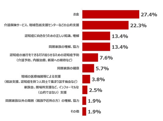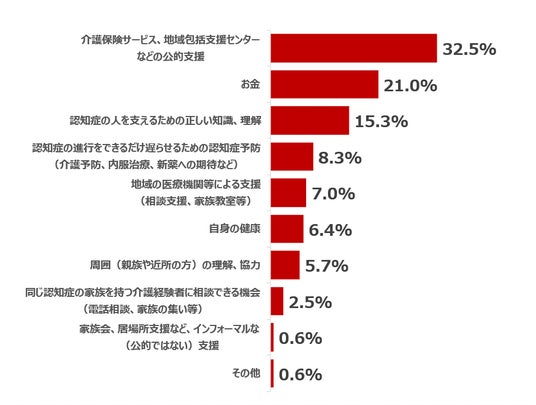 「一緒に暮らす家族等」が認知症(または軽度の認知機能障害)になった際は、まずは「介護保険サービスや地域包括支援センターといった公的支援」を必要としますが、それを支える立場として「お金」や「認知症の人を支えるための正しい知識、理解」の必要性を感じていることがわかりました。ただ、公的支援を必要とする方が32.5%に留まっていることは、認知症は家族の問題として相談しづらく抱え込んでいる可能性も考えられるため、広く誰もが認知症を理解し支え合える世の中にしてくことが大切なのかもしれません。