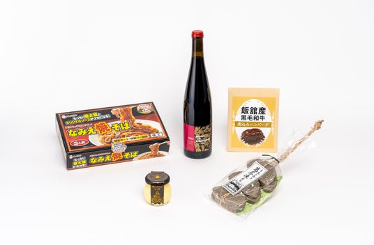 2024年6月27日(木)よりBEAMS JAPAN(新宿)で販売する、福島県「あぶくまロマンチック街道」沿線地域の産品(左から)なみえ焼そば、ゆいプリン、飯舘牛の煮込みハンバーグ、凍み餅、かわうちワイナリーのワイン