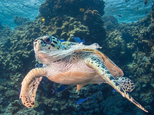 ▲漂流ゴミが体に巻き付いたままのウミガメ