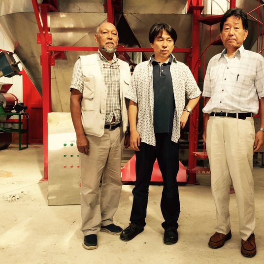 コロンビア・カウカにあるのサザコーヒー農園の中の精製工場、左から モレノ博士、中央 鈴木太郎、右 鈴木誉志男