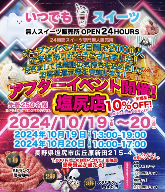 全国100店舗の美容サロンを展開する株式会社Createur(クレアトゥール)(所在地:広島県中区、代表取 締役:⼄津健太朗)に併設しオープンしている、お取り寄せスイーツを手軽に一つから購入できる!をコ ンセプトにした~無人スイーツ販売店~「いつでもスイーツ塩尻店」にてOPENイベント2,000人突破を記念しアフターイベントを開催致します。