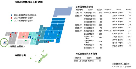 日本管財グループの包括管理業務の実績は、現在全国で25件となり、市場シェア率は業界トップ*です。2024年度からは、新たに6件(座間市・福山市・野田市・豊岡市・丸亀市・広陵町)の地方公共団体で業務を開始しました。今後も全国的に包括管理を導入する自治体の増加が見込まれることから、これまでの実績や蓄積したノウハウを活かし、更なる事業の拡大に取り組んでまいります。