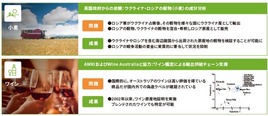 「産地の証印(TM)」は日本に先んじて、海外で多くの実績があります。そのひとつが、穀物をめぐるウクライナ-ロシア間の問題です。同じDNAを持つ小麦がある穀倉地帯。DNA鑑定では同じになってしまいますが、原産地を特定することで、「略奪されたものではないか?」という検証をすることができます。本来はウクライナ産である穀物を、ロシア側が自国産の穀物と混合したり、嵩増ししたりしてロシア産として販売してしまうと、その利益が戦争の資金源に繋がる可能性があるのです。そのようなことを避けるべく、検証しているという信頼のある技術です。他にも、コーヒーやワイン、アワビ、肉類など、あらゆる食品や加工品での実績があります。食品に限らず、鉱物、金属、レアメタルなどの原産地を証明することも可能です。
