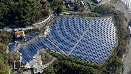 三角線「三角」駅から車で3分。本島と熊本県の上天草市間に架かる天門橋の麓のホテル跡地を再活用した太陽光発電所です。