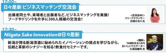 10月10日(木)午後5時から300人規模のビジネスマッチング交流会を実施。新潟が誇る新潟清酒に秘められたイノベーションの視点を学びながら日本酒のテイスティングができるセミナーも同時開催。